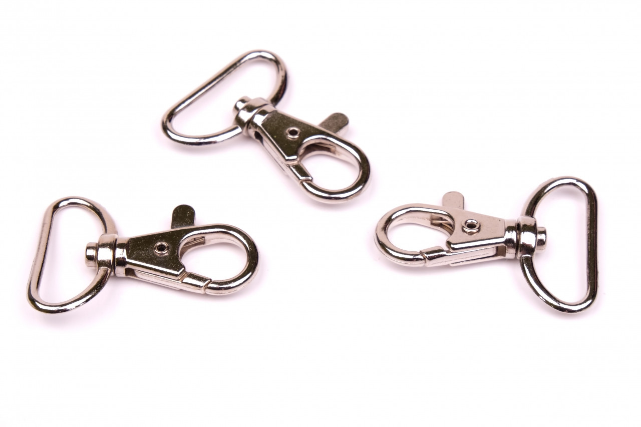 Karabina kovová otočná - použití: připojení popruhů na tašky, kabelky, klíčenky, psaníčka nebo brašny.