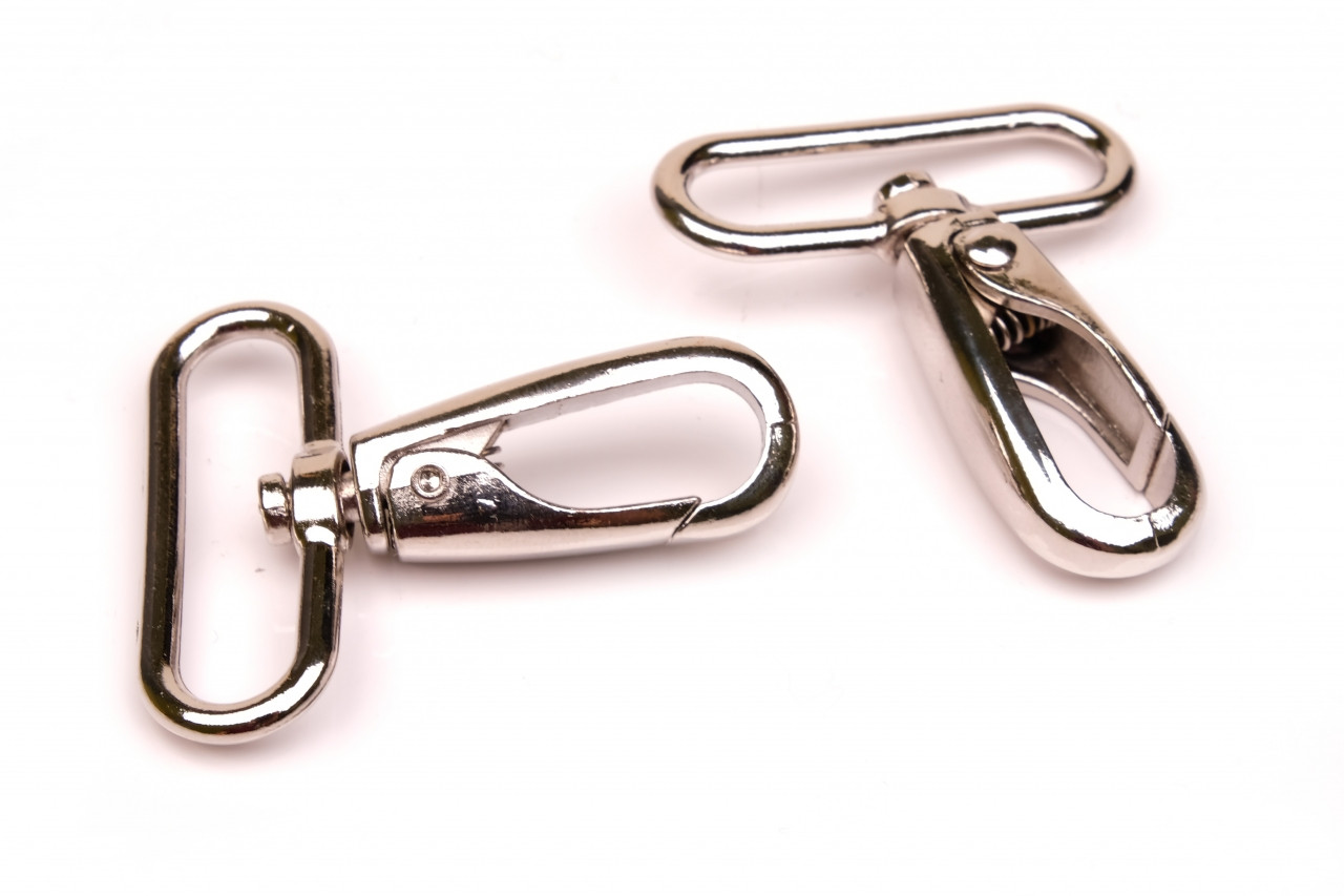 Karabina kovová otočná - použití: připojení popruhů na tašky, kabelky, klíčenky, psaníčka nebo brašny.
