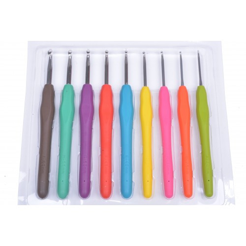 Kovový pletací háček s gumovou ručkou různých barev. Díky gumové rukojeti se s háčkem velmi dobře pracuje. Mix obsahuje 9 ks háčků o velikostech 2 - 2,5 - 3 - 3,5 - 4 - 4,5 - 5 - 5,5 - 6.