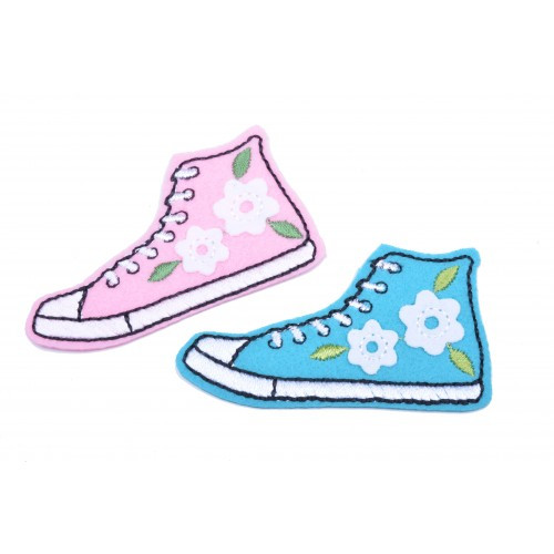 Nažehlovací aplikace ve tvaru boty se používá jako modní doplněk nebo na opravy oděvů.