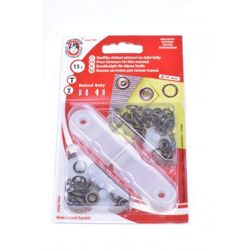 Stiskací knoflíky se využívají ke spojování jemných, slabých a poddajných druhů látek - froté, úplet, košilovina apod. Součásti balení je mini lis, se kterým se provádí nýtování knoflíků.
