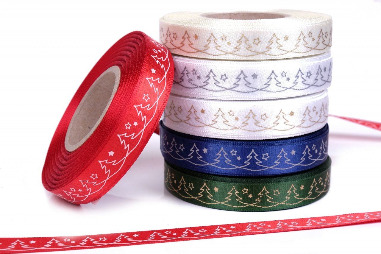 Stuha atlasová oboulící šíře 15mm vanoční stromky