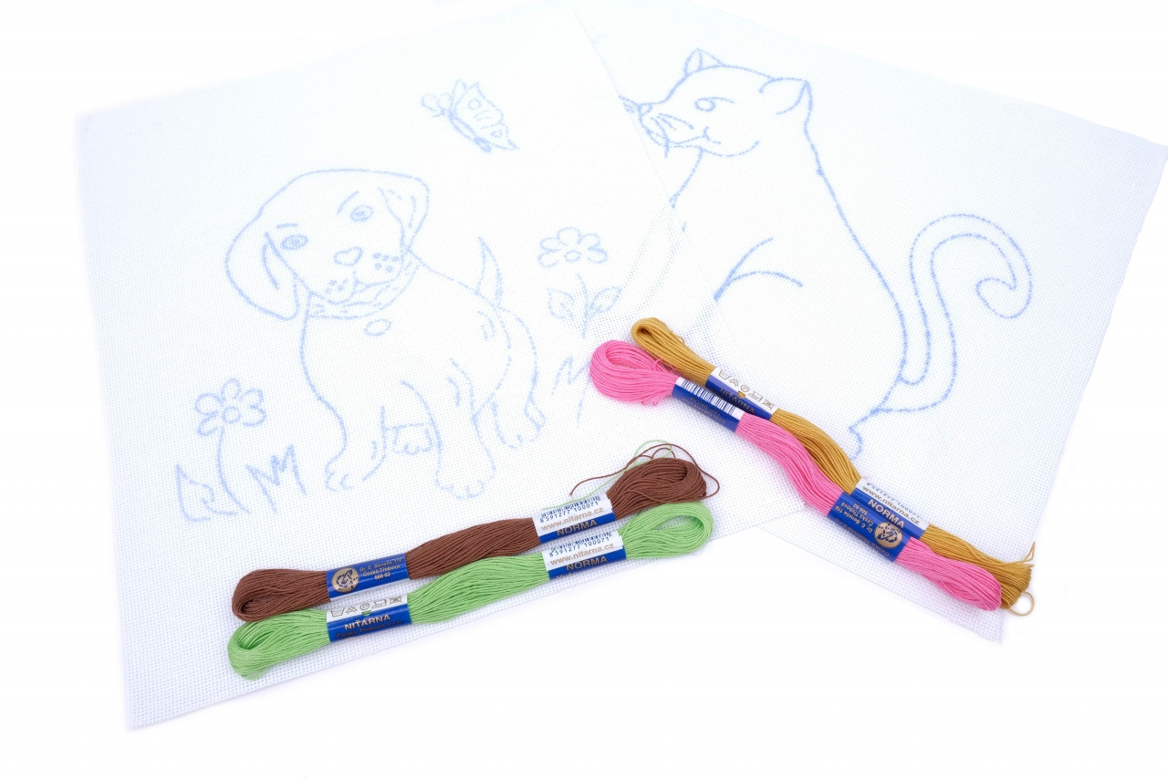 Souprava obsahuje: dvě vyšívací předlohy na které je natištěný motivek o rozměrech 23 x 25 cm, vyšívací přízi mouline 4ks. Tato souprava vyšívání je vhodná pro děti od 6 let.