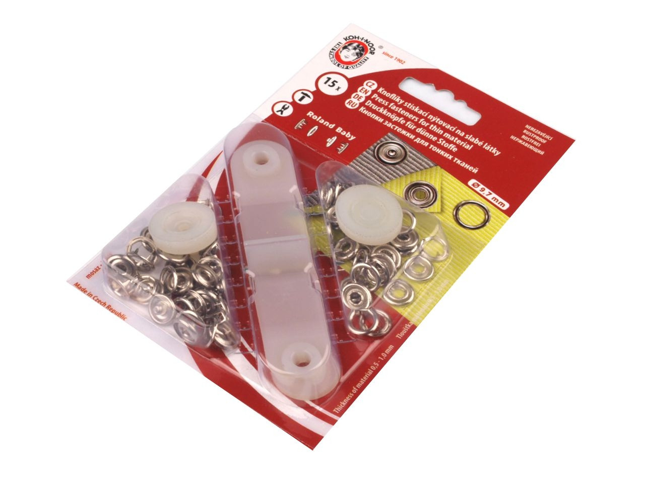 Na blistru je 15 ks nýtovacích knoflíků o velikosti 9,7mm. Knoflíky se používají ke spojování jemných druhů látek. Nýtování se provádí mini lisem, který je součást balení. Knoflíky stiskací nýtovací jsou nerezavějící.