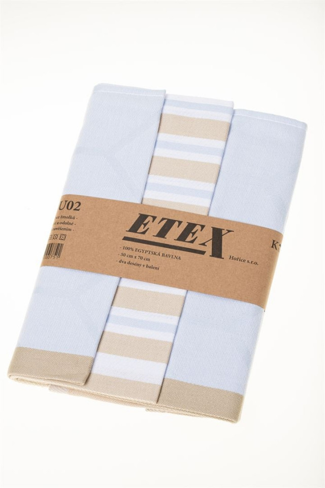 Kuchyňské žakárové utěrky s praktickým poutkem na zavěšení z česané příze, kde jsou vždy dva desény laděné do barvy.