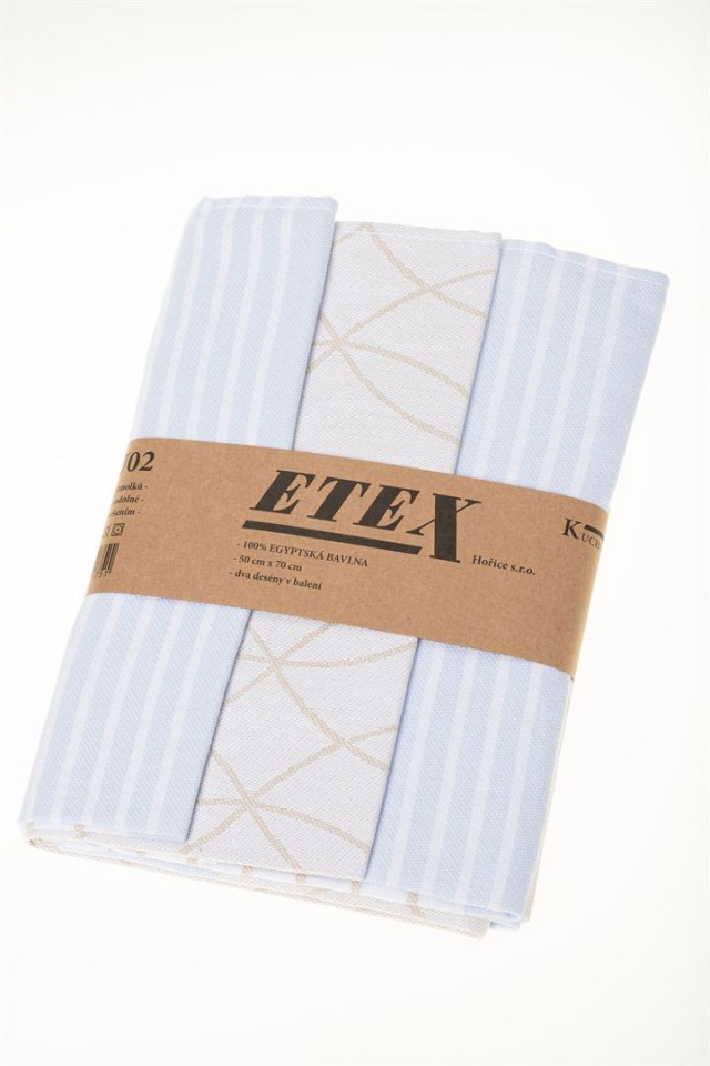 Kuchyňské žakárové utěrky s praktickým poutkem na zavěšení z česané příze, kde jsou vždy dva desény laděné do barvy.