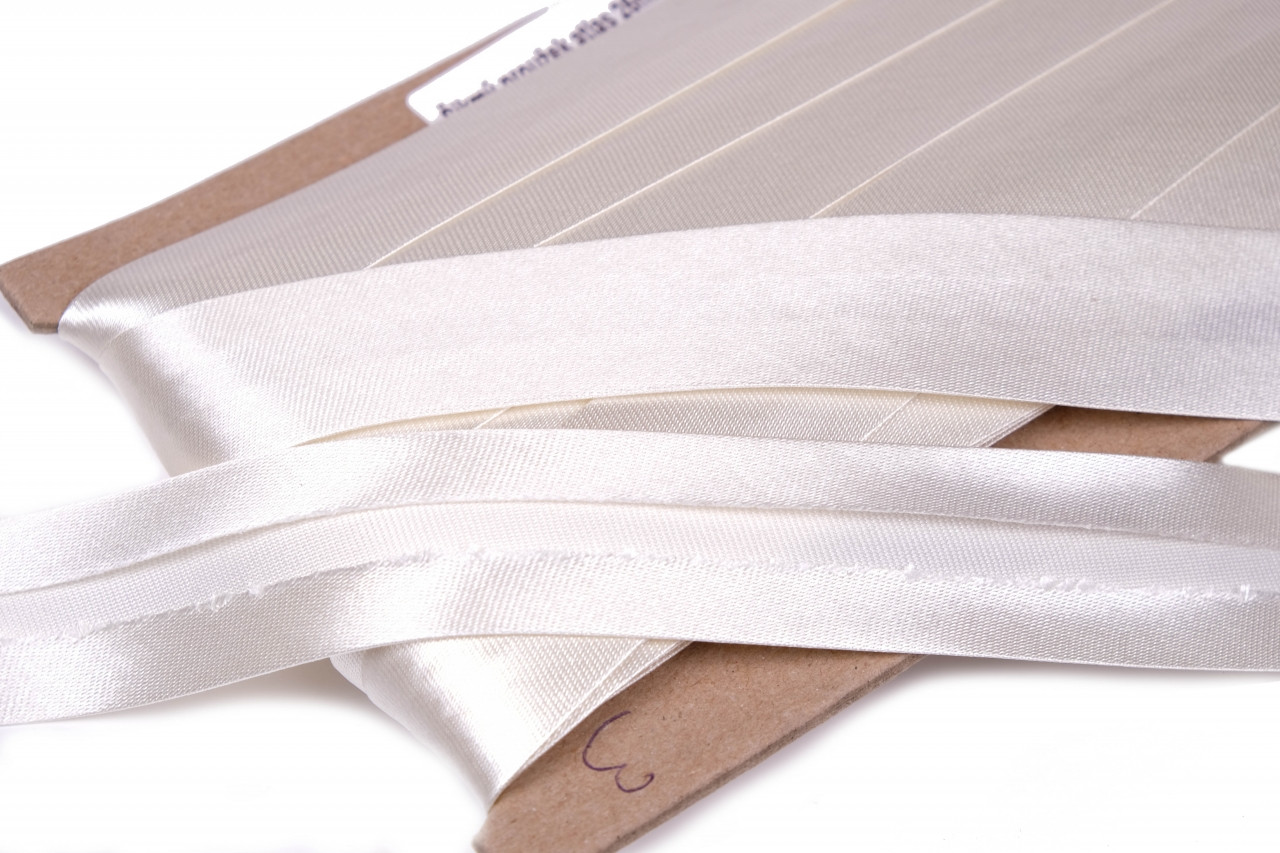Šikmý proužek atlasový nebo taky saténový je zakládaný do středu, rovnoměrně z obou stran. Je vhodný k olemování lehké dámské konfekce, jemného bytového textilu, záclon, závěsů atd. Alternativní název: šikmý proužek, šikmá stuha zakládaná doprostřed, ozdobná lemovka, ozdobná lemovka lesklá.