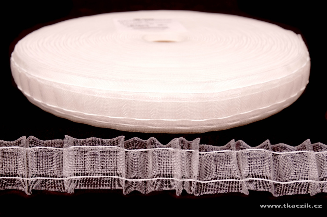 Záclonovka čirá, šíře 30mm se používá ke stejnoměrnému nařasení 1:3,75 záclon a závěsů. Záclonovka má ze spodu 2 šňůrky, které stačí zatáhnout. Alternativní název: průhledná záclonovka, silonová lemovka, záclonová řasící stuha, řasící lemovka.