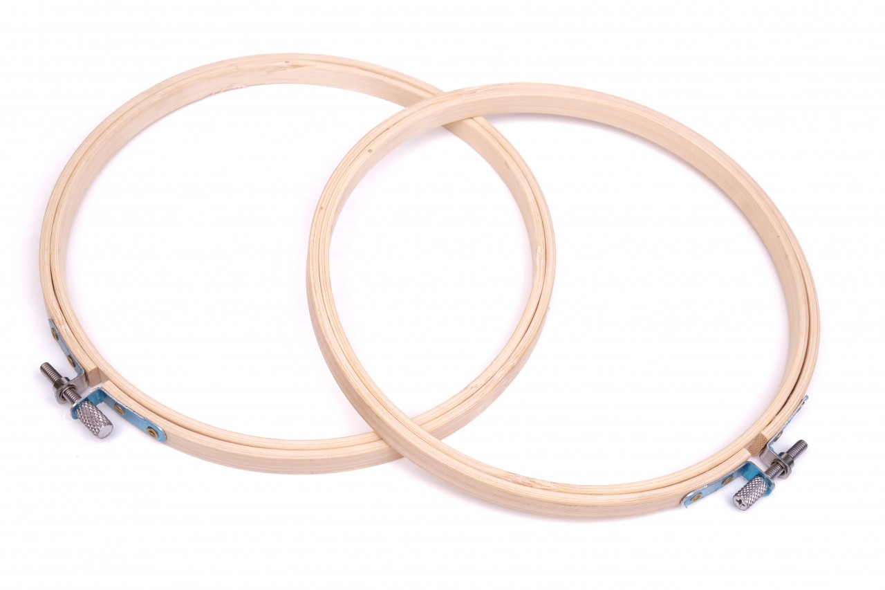 Dřevěný kroužek na vyšívací tkaniny s kovovým stahovacím šroubkem.