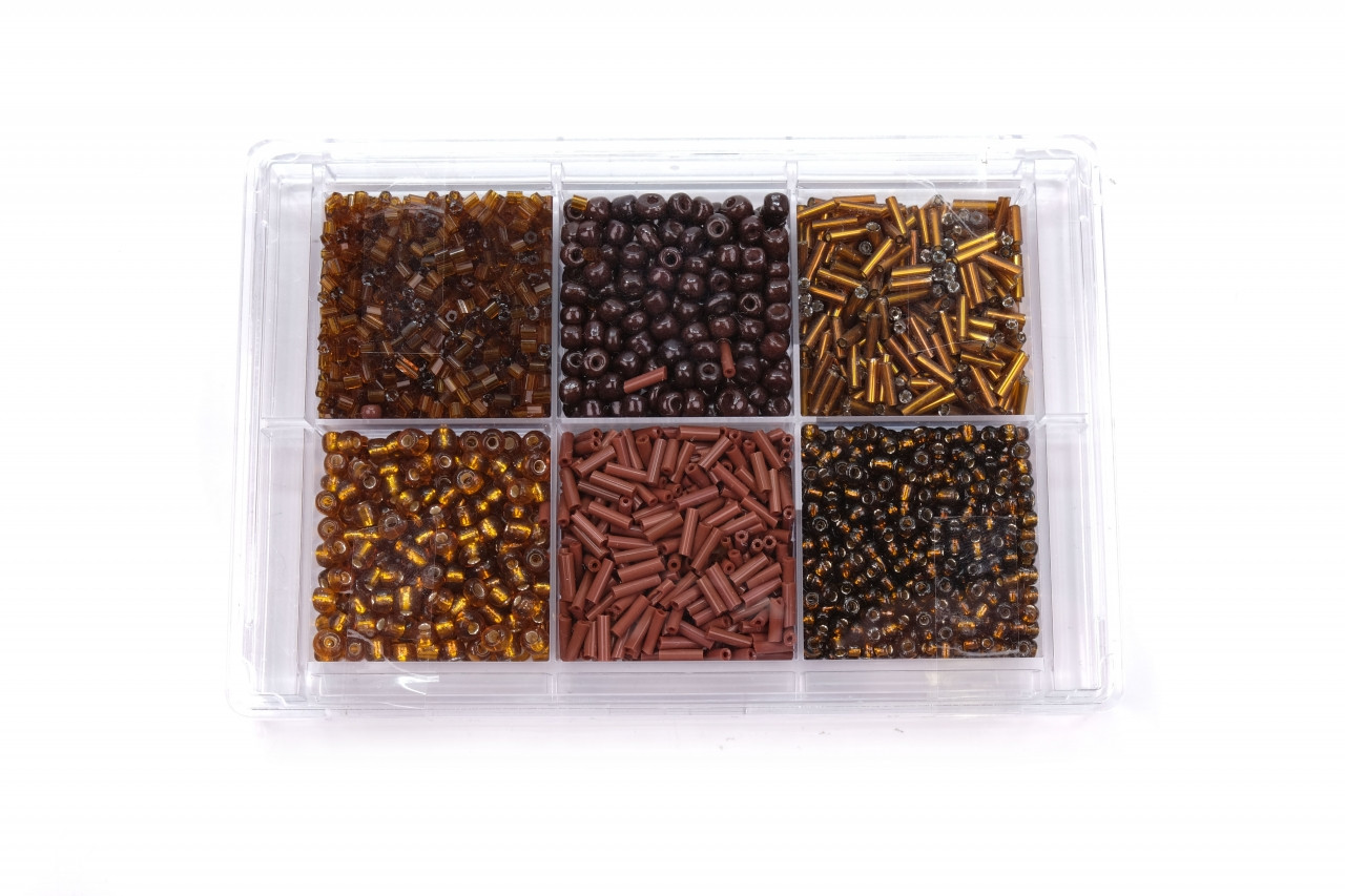 Skleněné korálky nadružené v různých velikostech, druzích a barvách v plastové krabičce se šesti zásobníky, váha obsahu cca 80 g. Nevhodné pro děti do 6 let. Alternativní název: skleněné korálky, skleněné perličky, mačkané korálky.