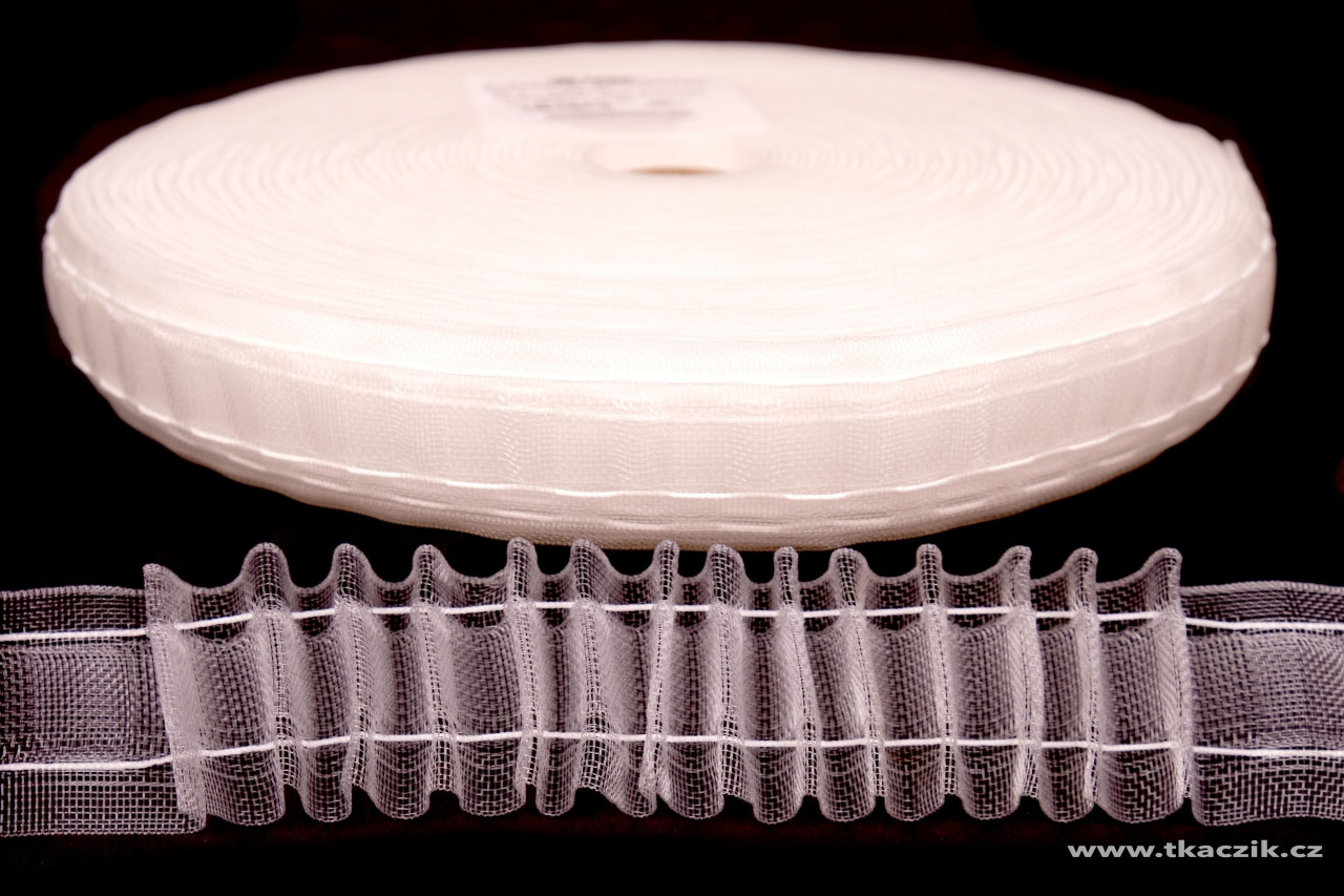 Záclonovka čirá, šíře 27mm se používá ke stejnoměrnému řasení záclon a závěsů. Záclonovka má ze spodu 2 šňůrky, které stačí zatáhnout. Alternativní název: průhledná záclonovka, silonová lemovka, záclonová řasící stuha, řasící lemovka.